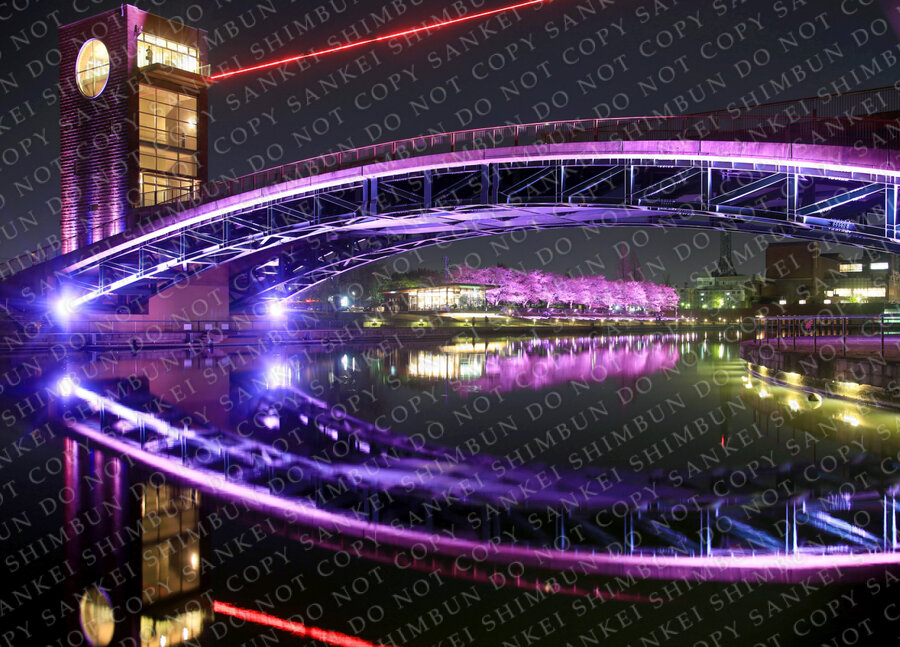 | 作品説明 | 富山市の「富岩運河」。水面に映り込んだ天門橋。ライトアップは毎晩行われ、市民の憩いの場となっている。富岩運河環水公園では、春には桜並木もライトアップされる=富山市 |