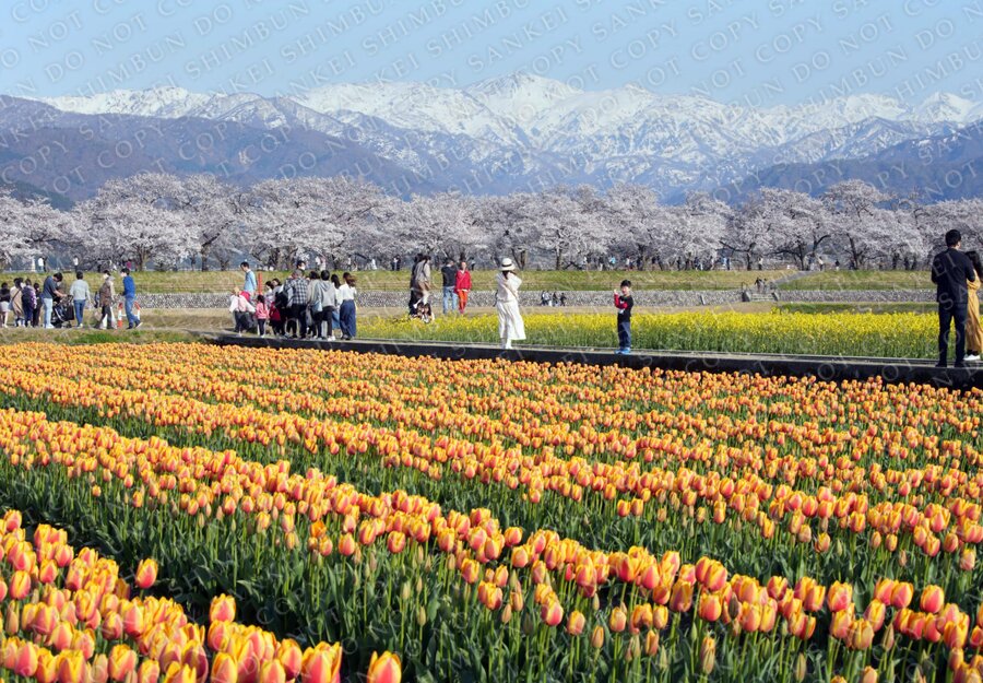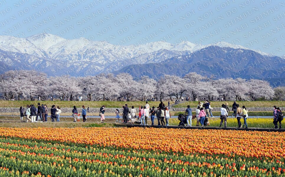| 作品説明 | 残雪の北アルプスを背景に桜並木、菜の花、チューリップが咲く舟川べり「春の四重奏」=富山県朝日町 |