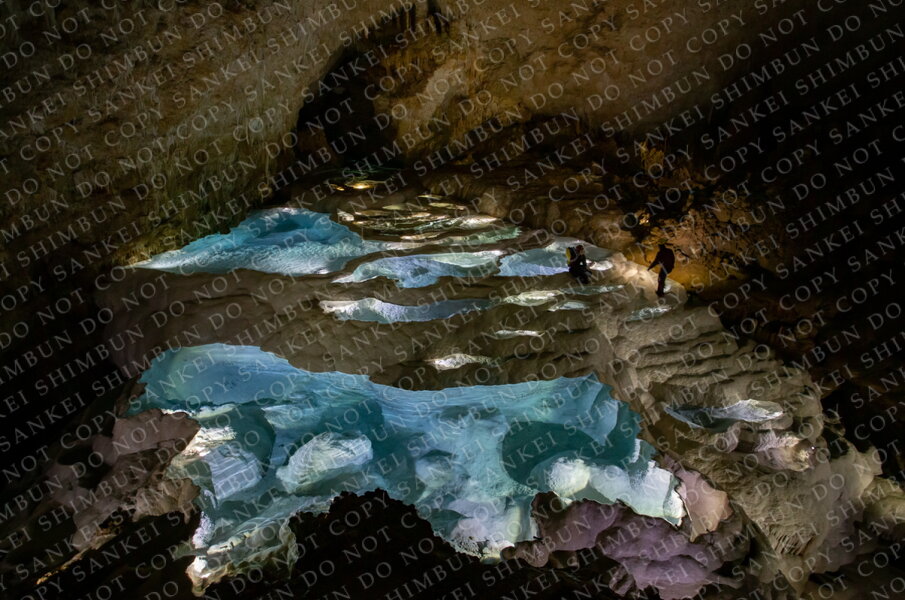 | 作品説明 | 銀水洞の大ホール。ライトで照らすと全貌が浮かび上がった=鹿児島県の沖永良部島 |