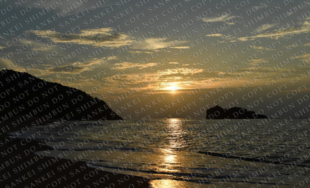 | 作品説明 | 白兎海岸から望む淤岐島。夕陽の彼方には大国主命の国・出雲がある=鳥取市 |