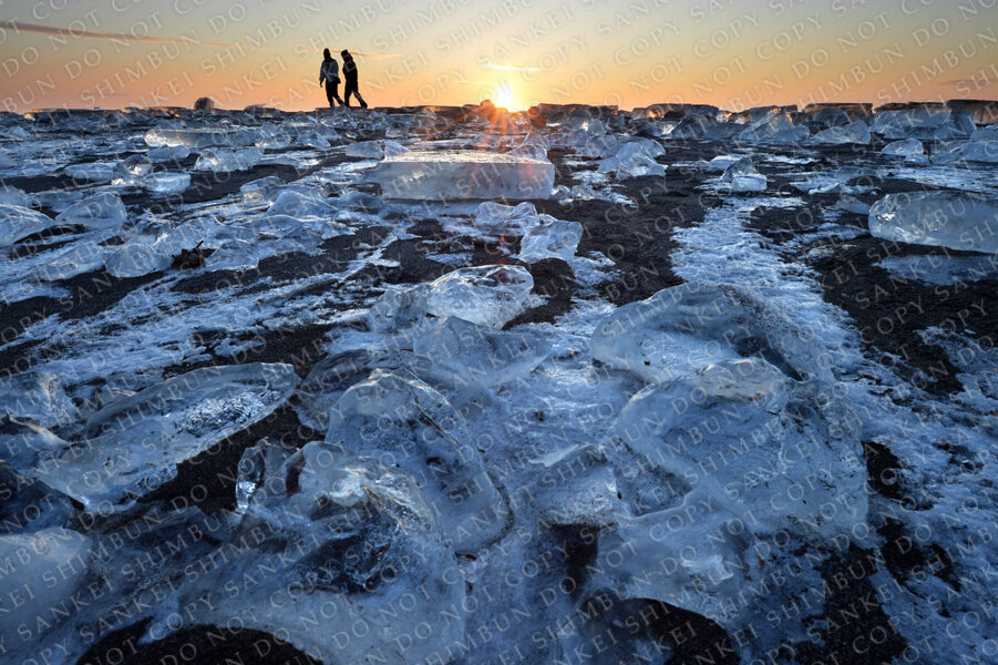 | 作品説明 | 大津海岸に打ち上げられ、朝日に照らされる「ジュエリーアイス」=北海道豊頃町 |