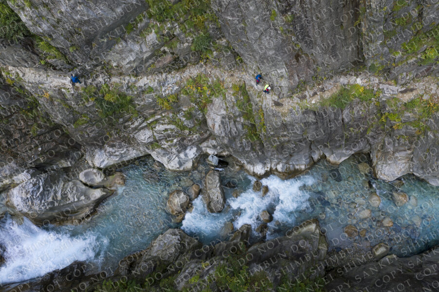 | 作品説明 | 水面から高さ20メートルの岩肌に登山道が続く下ノ廊下。眼下には黒部川が流れる=富山県立山町 |