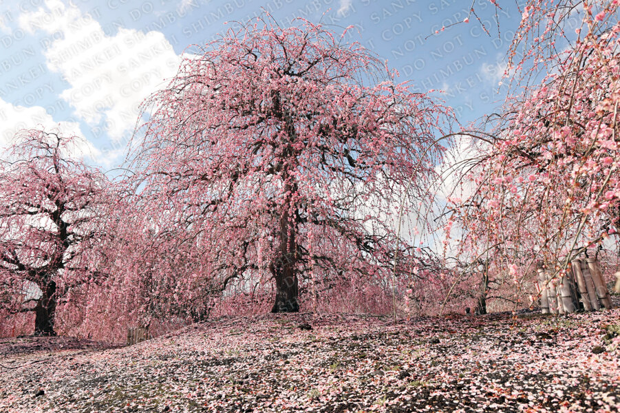 | 作品説明 | 青空の下で咲き誇るしだれ梅。流れるような枝ぶりには職人の技が生かされている=三重県鈴鹿市の「鈴鹿の森庭園」 |
