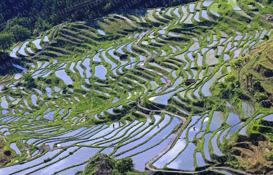 | 作品説明 | 昔ながらの手作業で稲作を行う丸山千枚田。棚田の水面に映る青空は、田植えの始まりを告げる風物詩だ=三重県熊野市 |