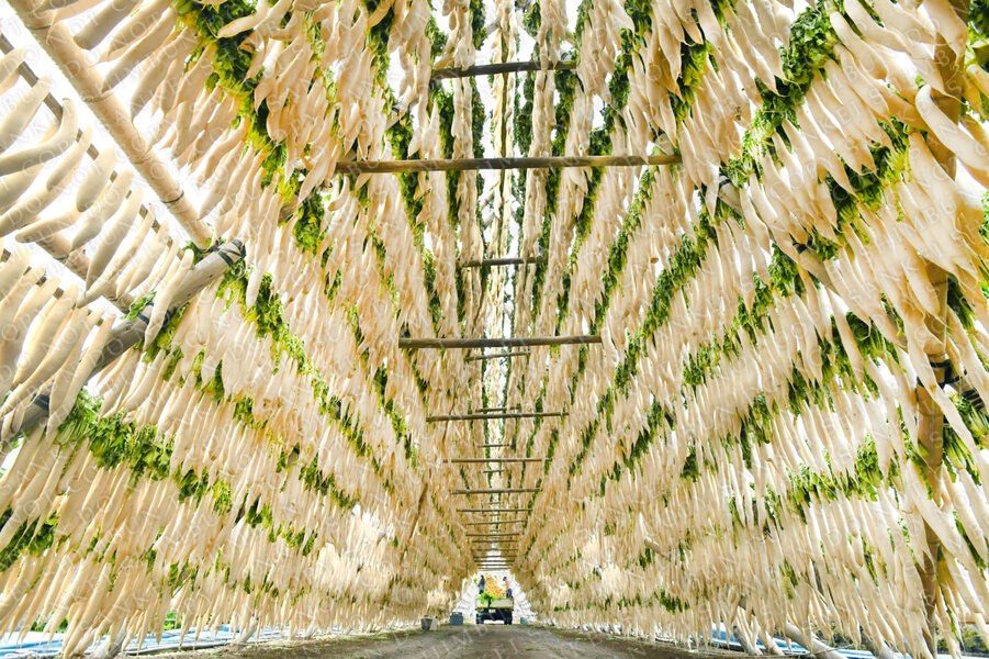 | 作品説明 | 漬物用の大根が干されるやぐらの内部。トンネルのようなやぐらは約150メートル続く=宮崎市田野町 |