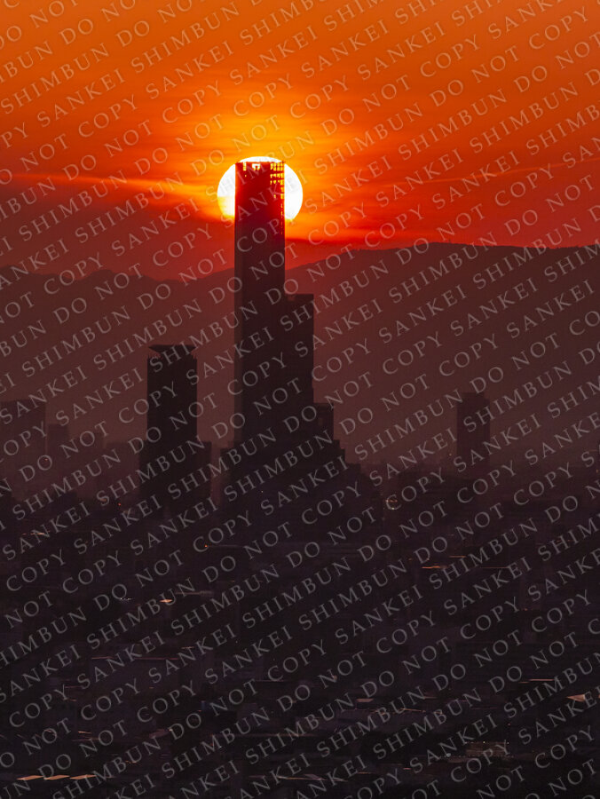| 作品説明 | あべのハルカスの展望台に重なる夕日。真っ赤な陽光がガラス窓を突き抜けた=大阪市 |