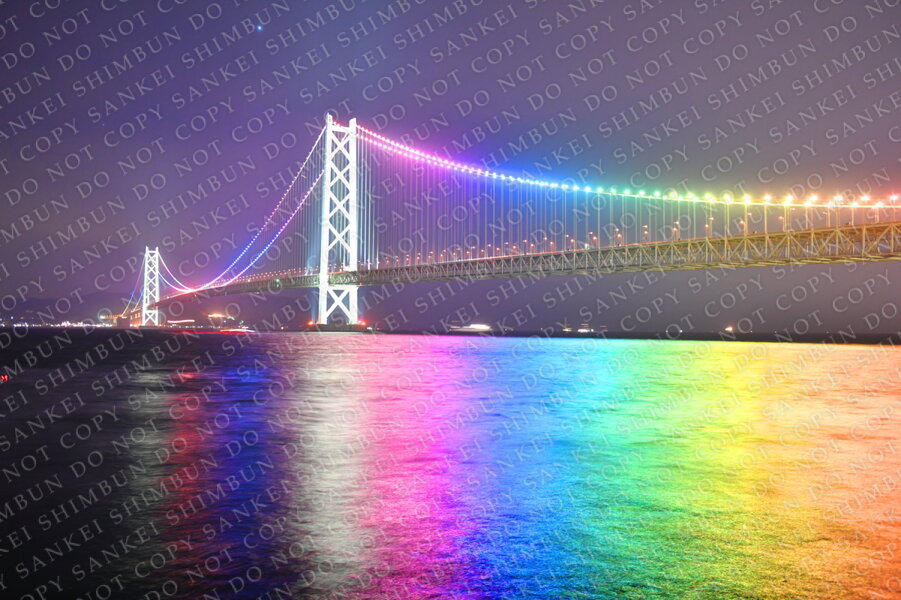 | 作品説明 | 開通20年を記念して虹色にライトアップされた明石海峡大橋=神戸市垂水区 |