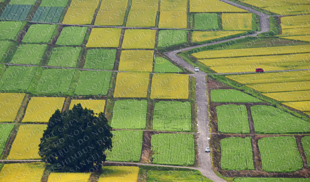 | 作品説明 | 山本山高原から望むコメとソバの田畑。黄金色に色づき始めた稲穂と緑のソバの葉がパッチワークを描く新潟県小千谷市 |
