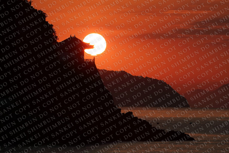 | 作品説明 | 磐台寺(ばんだいじ)は、阿伏兎(あぶと)岬にあるため、阿伏兎観音の名で古くから地元の人々の信仰を集めている。断崖絶壁に建てられた観音堂は冬場、瀬戸内海に昇る朝日を背にその美しいシルエットを浮かび上がらせる=広島県福山市沼隈町 |