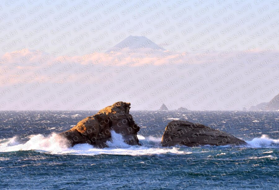 | 作品説明 | 牛着岩の奥に顔をのぞかせる富士山=静岡県松崎町雲見 |
