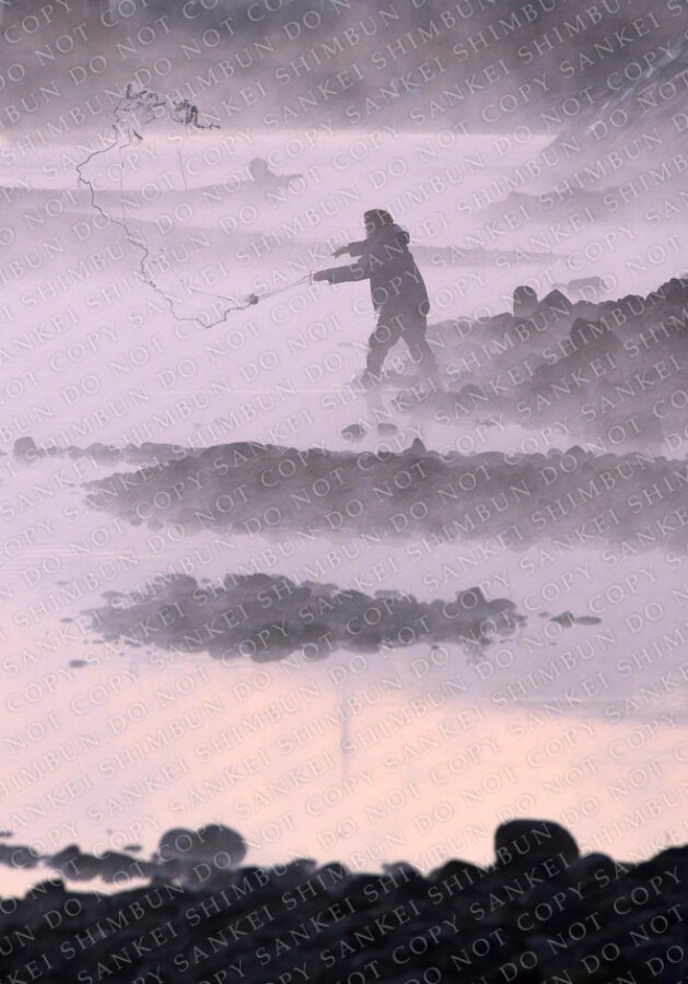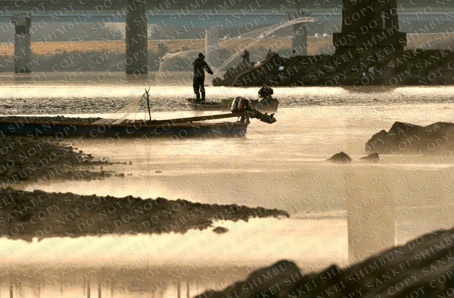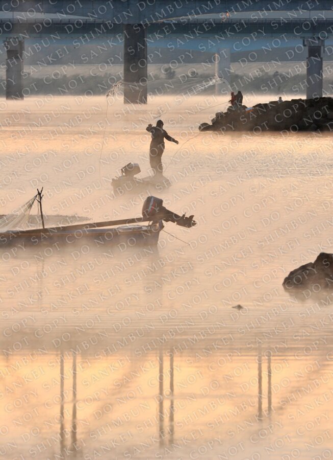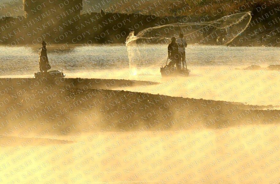 | 作品説明 | 冬の四万十川では、明け方暗いうちから鮎を狙って網を投げる人の姿が見られた =高知県四万十市 |
