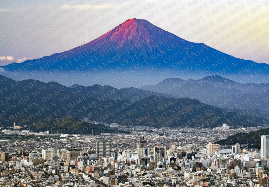 | 作品説明 | 夕日に照らされ、山頂がうっすら赤く染まった富士山と静岡市街=静岡市駿河区 |